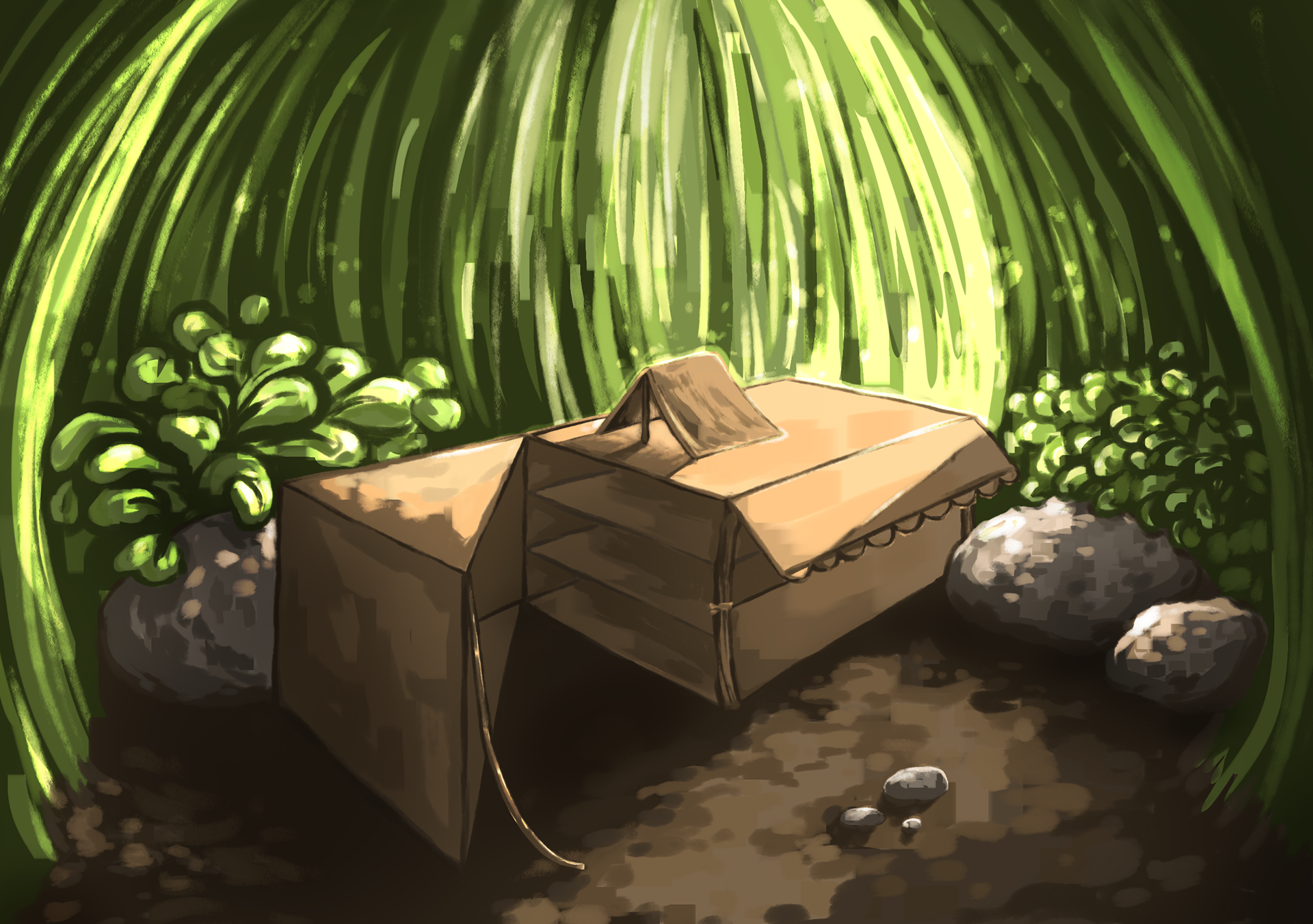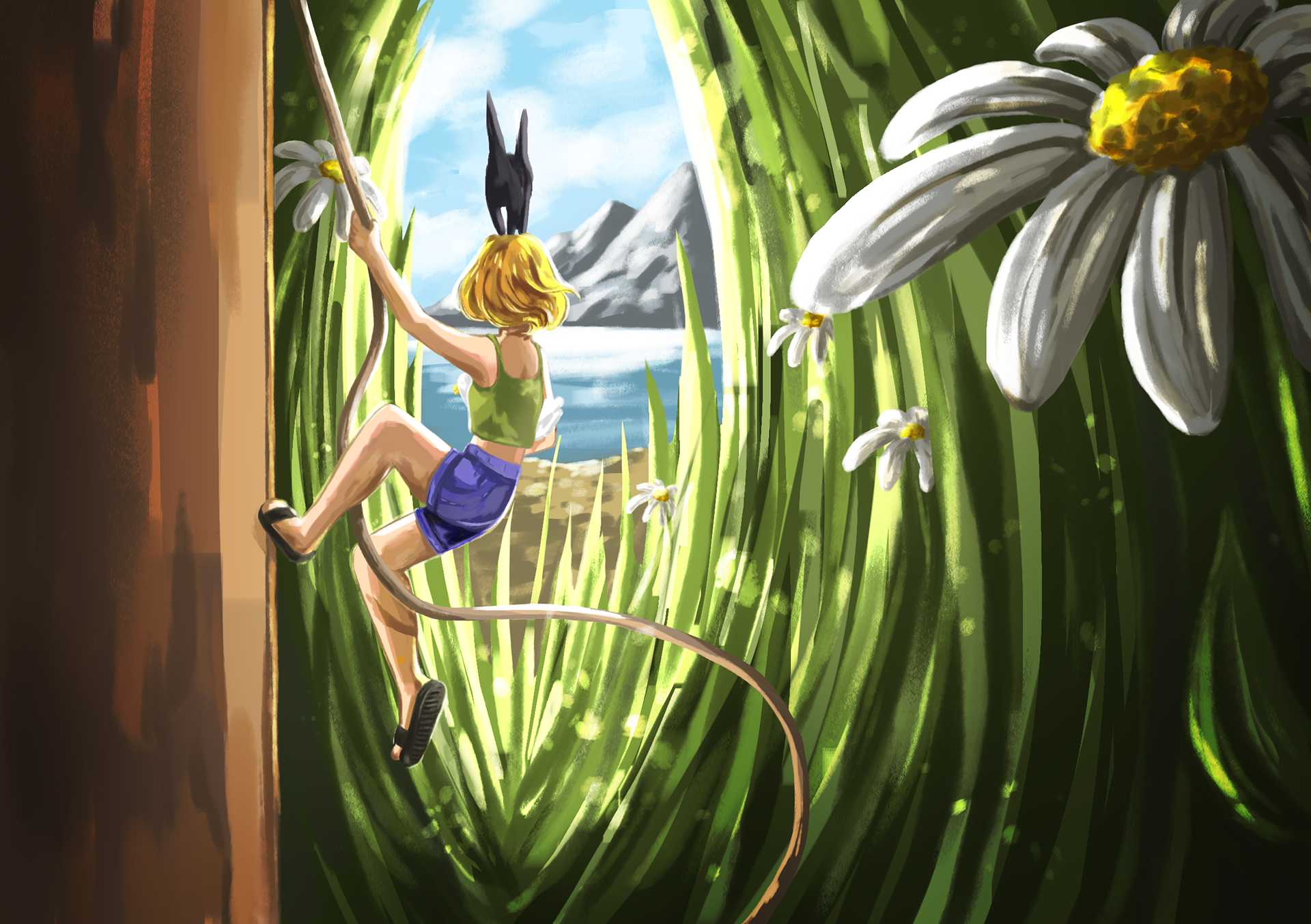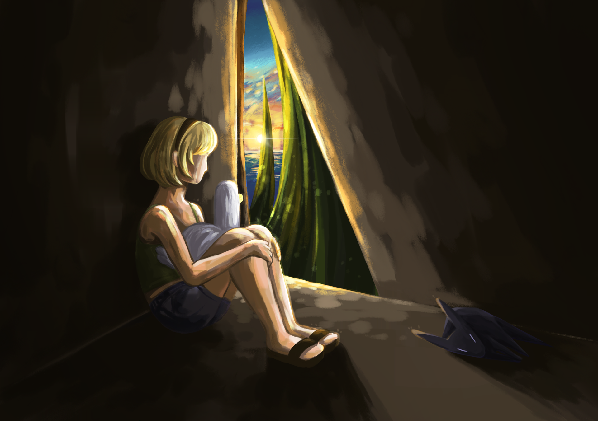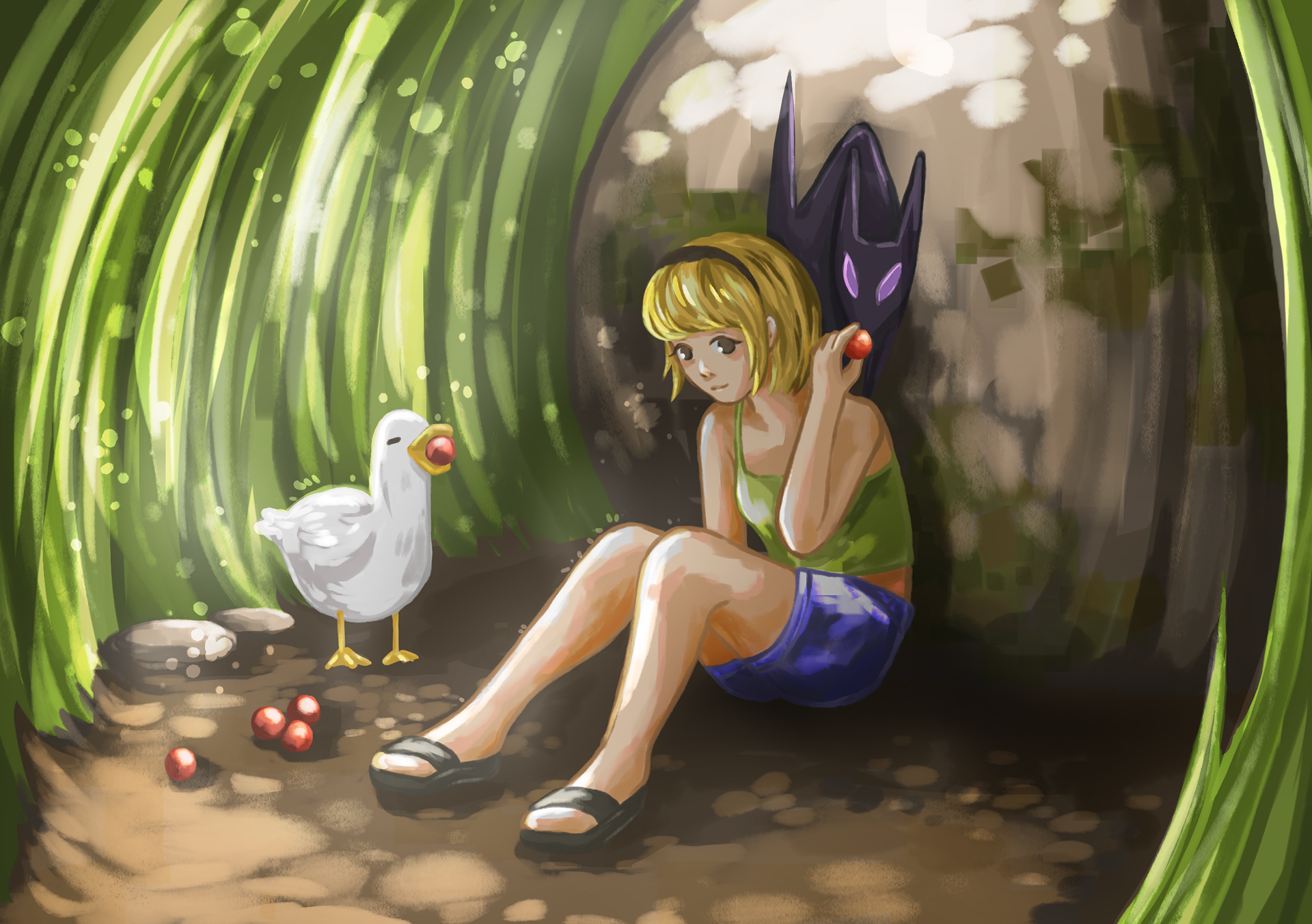 "Tiny" is an illustration series about a tiny girl and her even tinier companions. For these I experimented with composition, colors and lighting.
